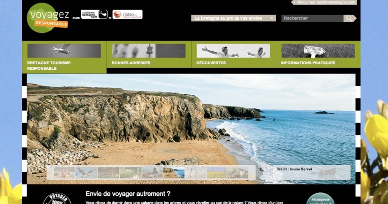 Pionnière en matière de tourisme eco-responsable, la Bretagne, avait déjà publié en 2010  le premier guide régional des bonnes adresses éco-responsables aux editions Viatao (guide TAO Bretagne). Le comité régional du tourisme de la Bretagne investit aujourd’hui le web avec un tout nouveau site http://voyagez-responsable.tourismebretagne.com/ .